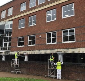 Clean down all external elevations brickwork/stonework including banding, coping stones, columns etc.